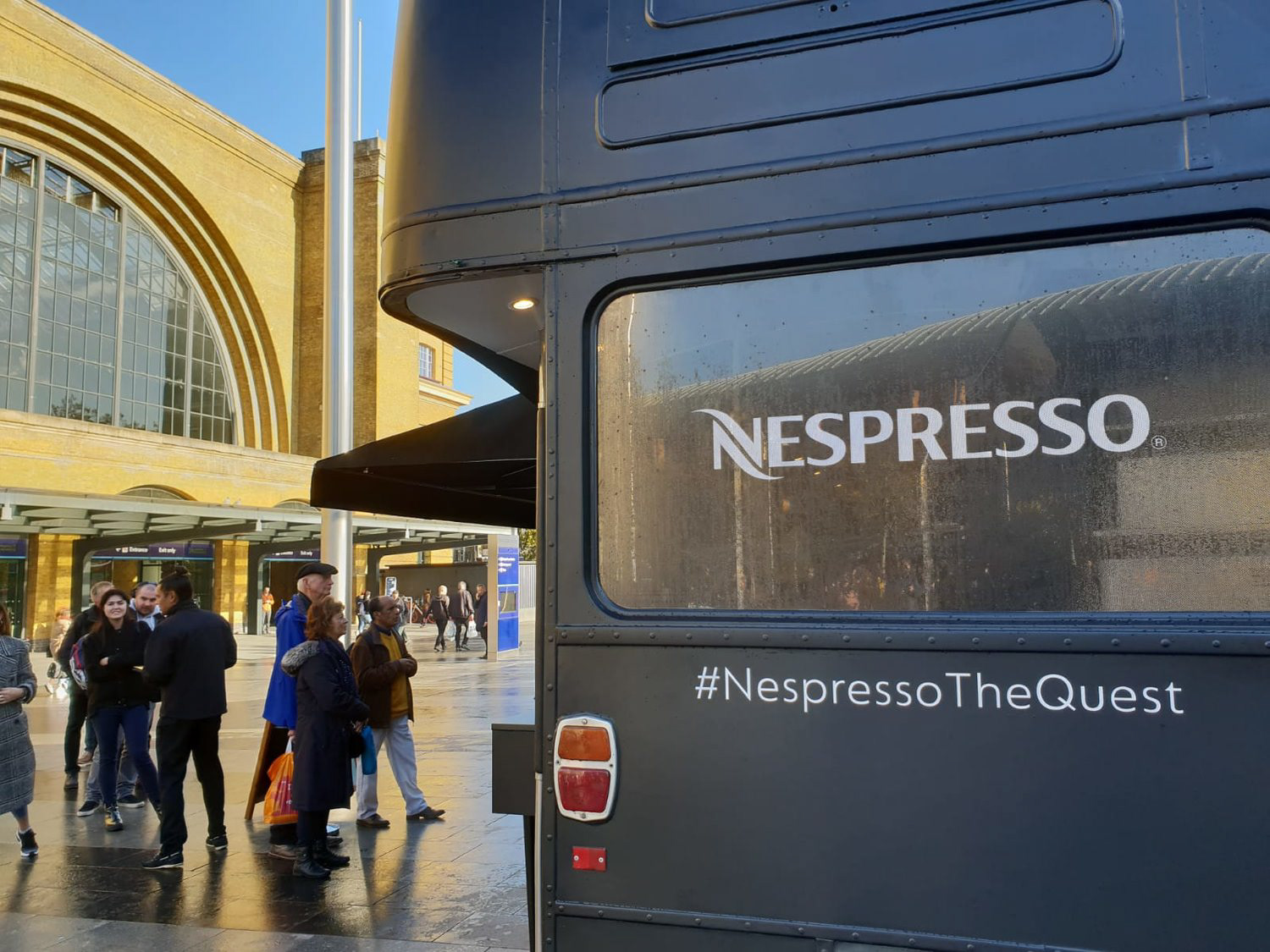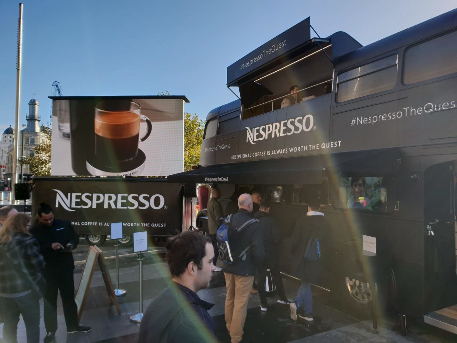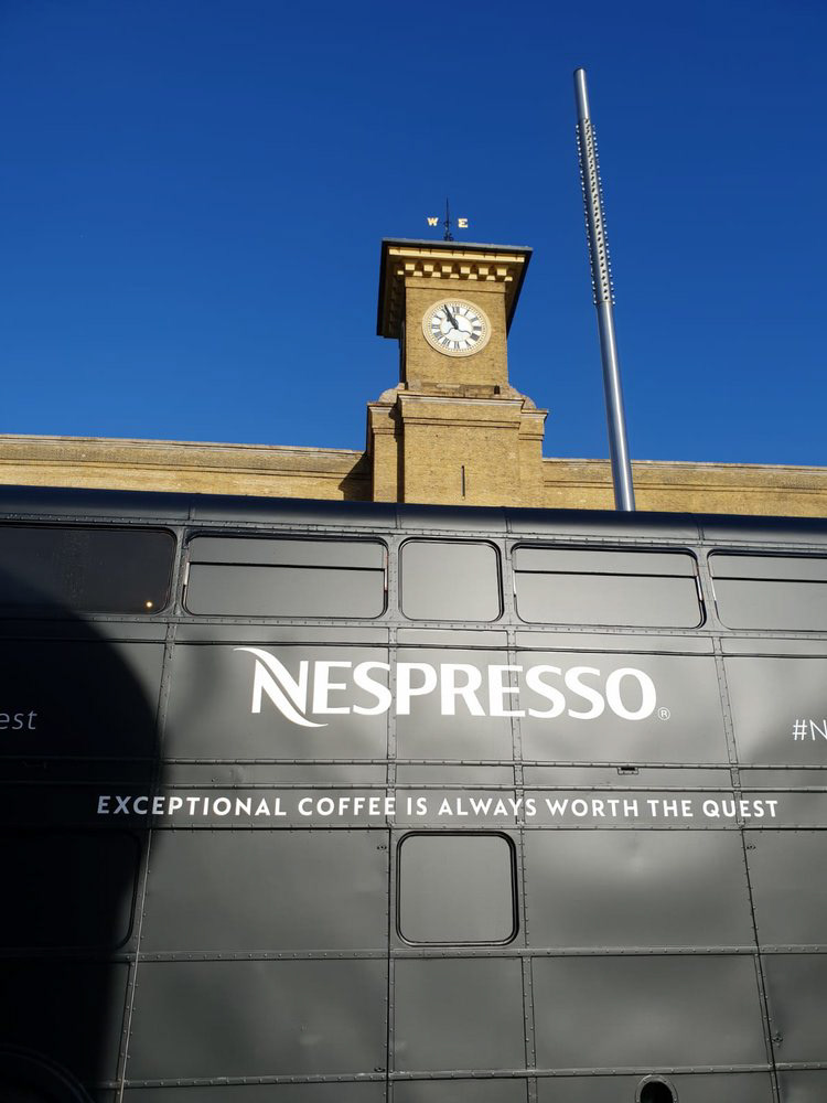 Inspired by the TV commercial that follows a noble knight (aka George Clooney) defy space and time to land on a busy bus in central London, we recreated the experience with a Nespresso branded Quest tour bus.